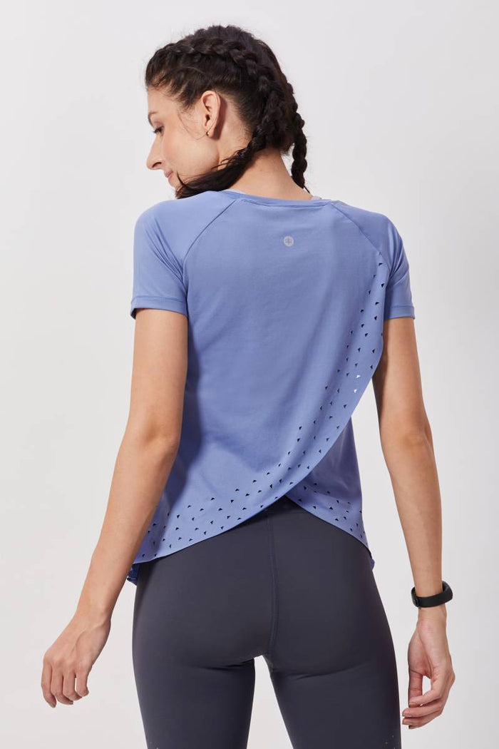 Blue Overlap Open Back Laser Cut Workout Top