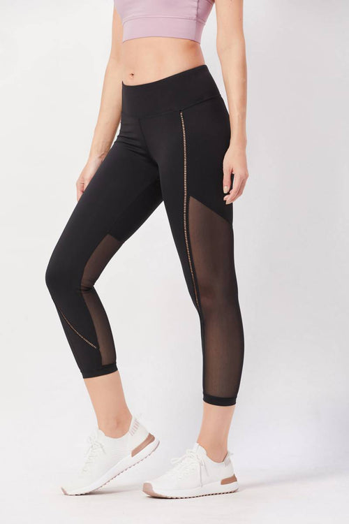 These tights deliver an updated look by combining the edgy ladder trim and breathable power mesh that moves with you. Mid-rise waist allows for secure and comfortable fit.