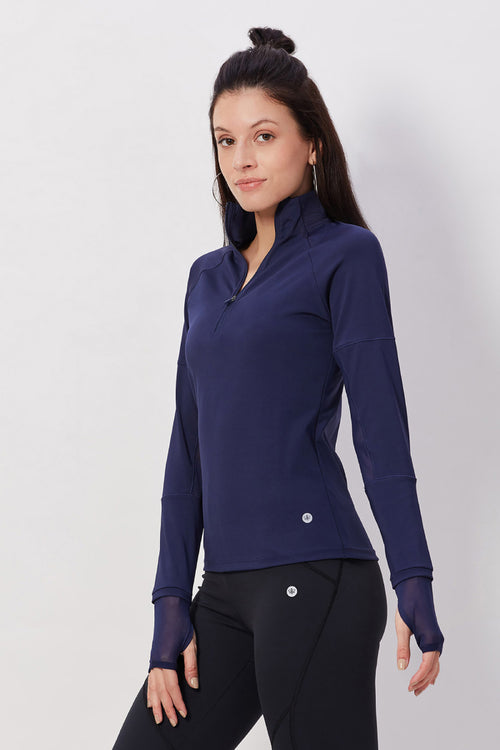 A half zip design lets you adjust your look. The mesh panels add a touch of breathable style and thumb holes secure the fit.
